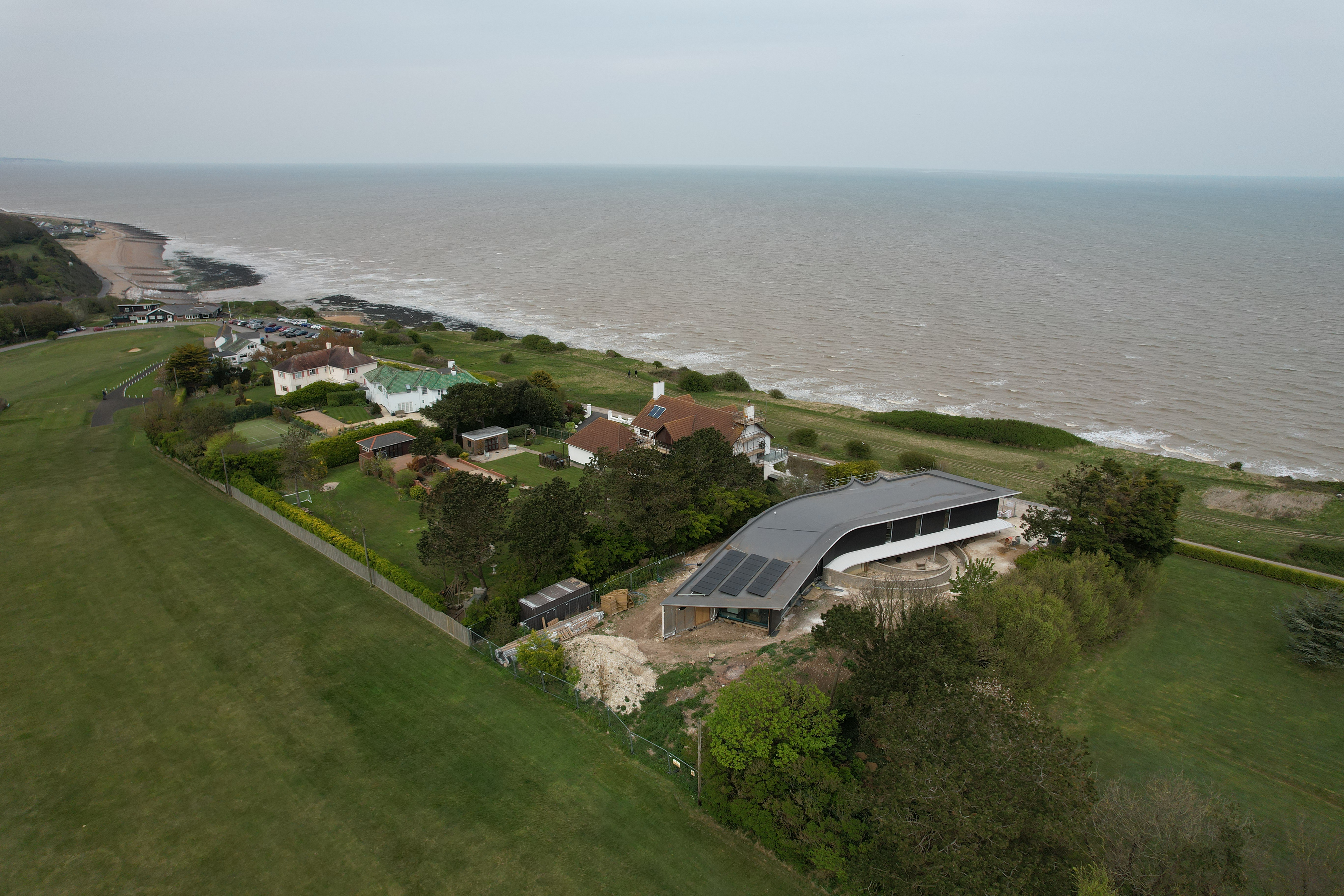 Structurally ambitious, the building features a dramatic cantilever and a fluid, rising roofline that responds to the dynamic coastal environment. Large glazed openings frame panoramic vistas of the English Channel, balancing visual drama with a low-profile presence that respects the site’s protected status. Finished in white render and a green roof, the design’s material choices combined with sweeping geometry tailors the building to its rugged setting.